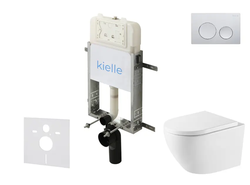 kielle Genesis New - Conjunto de instalación empotrada, inodoro Oudee, Vortex Rimless+, asiento con cierre suave y pulsador Gemini New I, cromo brillante