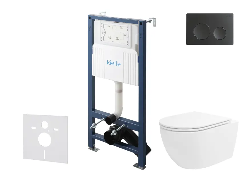 kielle Genesis New - Conjunto de instalación empotrada, inodoro Oudee, Vortex Rimless+, asiento softclose y pulsador Gemini New I, negro mate