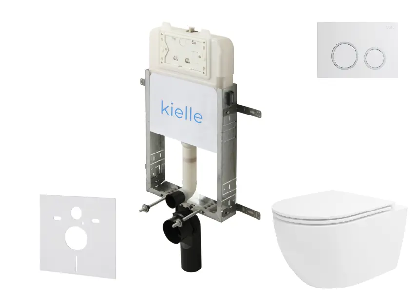 kielle Genesis New - Conjunto de instalación empotrada, inodoro Oudee, Vortex Rimless+, asiento softclose y pulsador Gemini New II, blanco brillante/cromo
