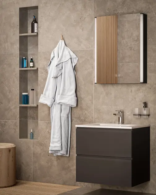 A fürdőszobaszekrény két fiókkal van felszerelve, amelyek elegendő helyet biztosítanak az alapvető piperecikkek tárolására. A fiókok lassan futó futókkal és automatikus zárórendszerrel vannak felszerelve. A kezelés ezért könnyű és csendes.