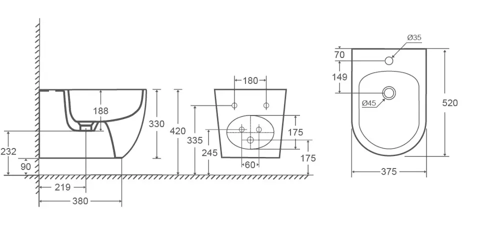 kielle Oudee - Hangend bidet, met overloop, kraangat, wit