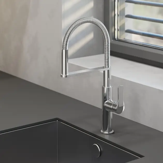 Bateria de bucătărie kielle Magnus impresionează prin aspectul său atemporal. Folosește cu pricepere efectul liniilor rotunjite, care se evidențiază frumos în finisajul cromat asortat. Maneta de comandă este amplasată pe partea laterală a bateriei și, datorită formei sale mai robuste, cocreează o impresie de stabilitate.
