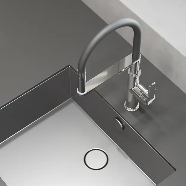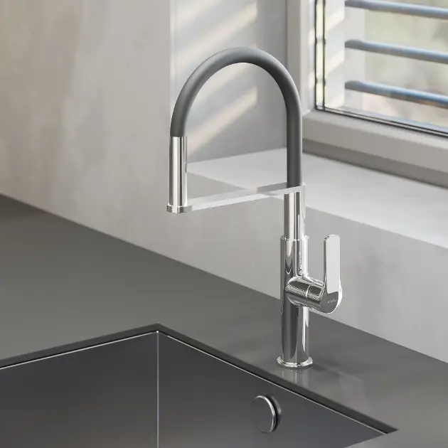 Designul modern al bateriei combină elementele cromate cu culoarea neagră a brațului flexibil. Rezultatul este o combinație atemporală, care se va impune atât în bucătăriile moderne, cât și în cele clasice. În plus, suprafețele sunt adaptate la mediul din bucătărie, astfel încât te poți bucura de aspectul frumos pentru o perioadă lungă de timp. Nici măcar nu trebuie să îți faci griji cu privire la calcar. De exemplu, bateria este echipată cu un perlator Neoperl Cascade SLC, din care îl poți îndepărta prin simpla ștergere a ochiurilor de plasă.