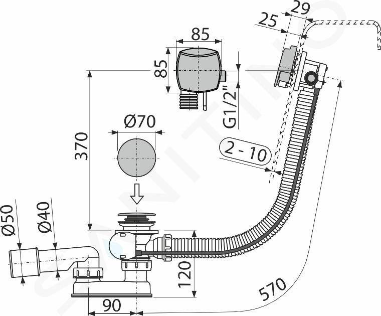 Setul de admisie, evacuare și preaplin pentru cadă nu este folosit doar pentru a umple cada cu apă, ci și pentru a evacua în siguranță apa din cadă către scurgere odată ce baia sau " spălatul hainelor" este terminat. De asemenea, acesta protejează împotriva revărsării apei. Este conceput pentru băi de dimensiuni standard cu o gaură de scurgere cu diametrul de 52 mm. Lungimea totală a sifonului pentru cadă este de 57 cm.