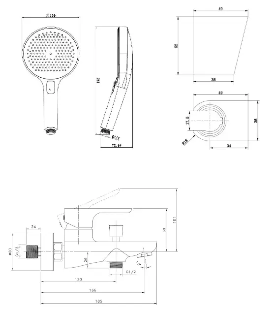 Baterie cadă cu montare pe perete, monocomandă